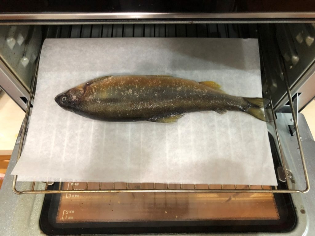 退冰後,流水清洗表面黏液 (有黏液代表新鮮急速冷凍),兩面抹鹽,送入洞房,ㄟ不是,是送入烤箱。230度炙燒模式20分鐘伺候,可翻可不翻面,最後美食上桌。