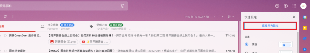 登入Gmail,找到右上角齒輪按鈕,找到 【查看所有設定