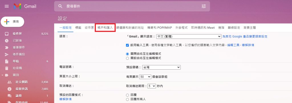 Step 1 . 找到Gmail 中的 【帳戶和匯入】設定。