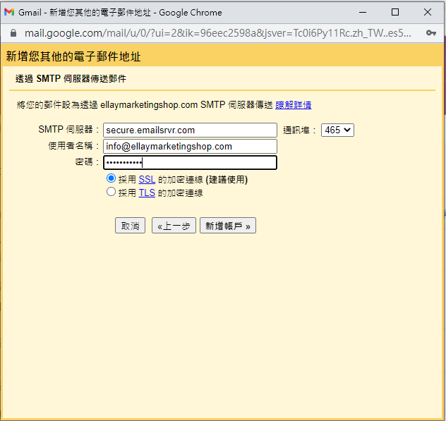 SMTP伺服器: secure.emailsrvr.com並選擇通訊埠465