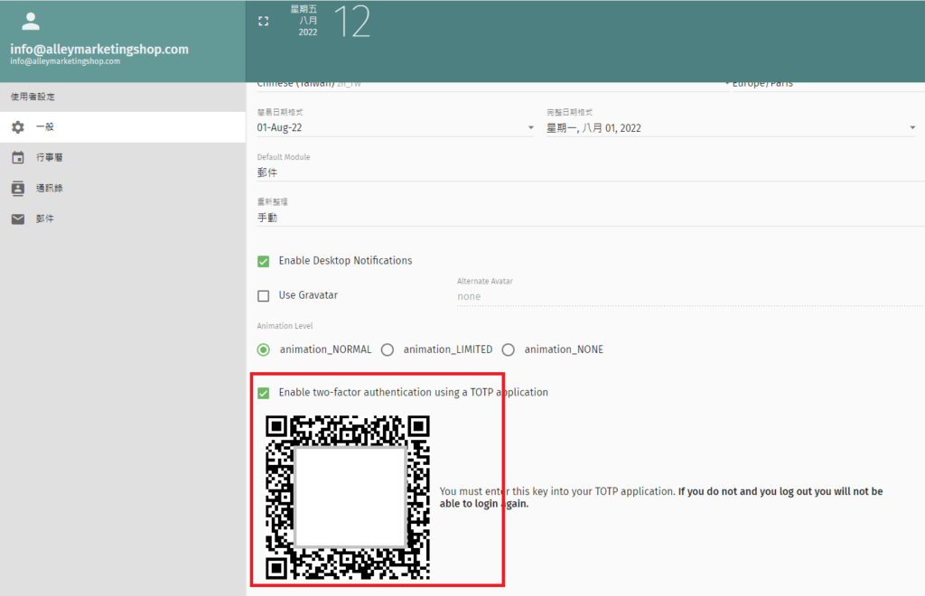Step 1 . 桌機或筆電打開SOGo Webmail ,開啟兩階段驗證功能,找到專屬的QR Code