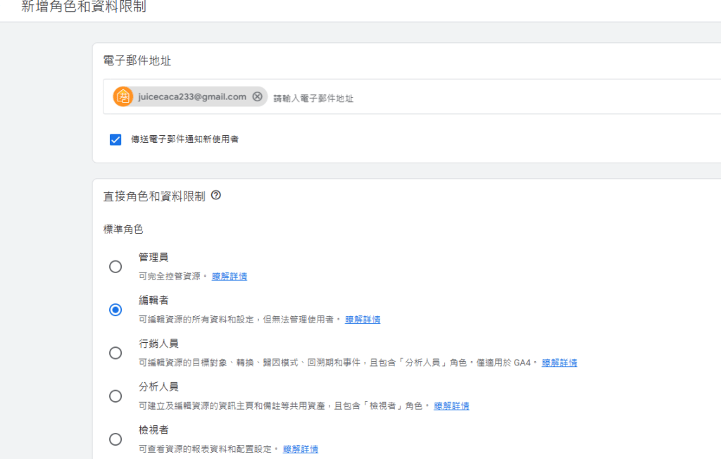 Step4. 新增使用者,然後輸入 該編輯者/管理員/檢視者 (視你的需求而定)的email ,接著送出即可。