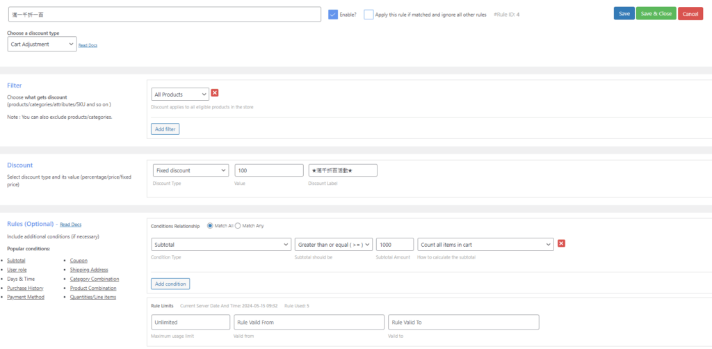 這個外掛也很值得購買付費版,可以設定到更多玩法,如滿千送百、買一送一、買A送B、買多折扣,類別商品全部8折等