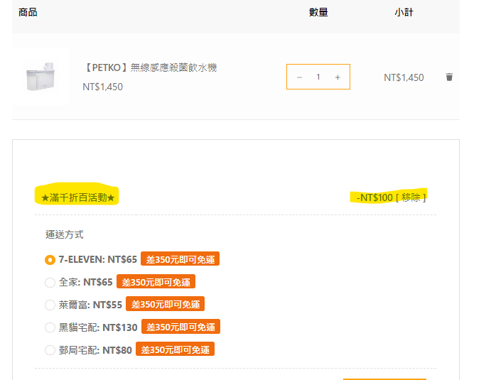 滿一千折一百的邏輯是 整體購物車優惠100元,base on 當小計超過1000元時。