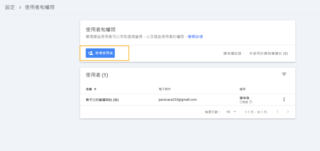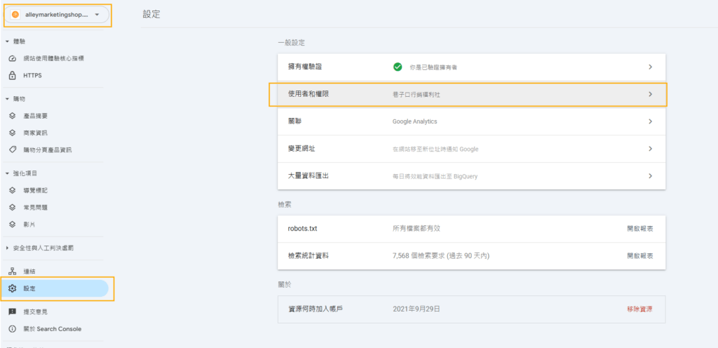 Step 1 進入自己的GSC帳戶,左下角 設定,找到使用者和權限,點開。