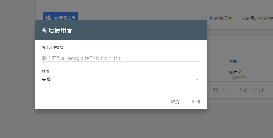 Step3. 輸入使用者的email (必須是gmail ),權限依自身需求選擇,最後送出新增即可。